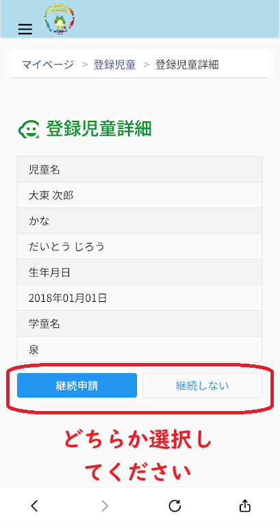 ④(継続申請)及び(継続しない)をクリック