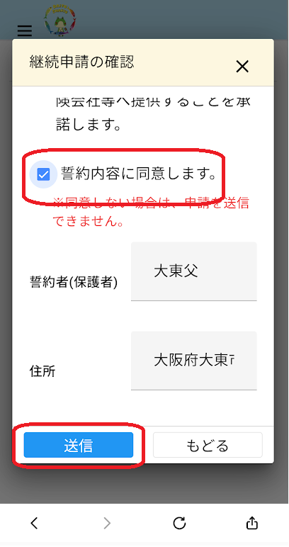 ⑥誓約内容に同意し、送信をクリック